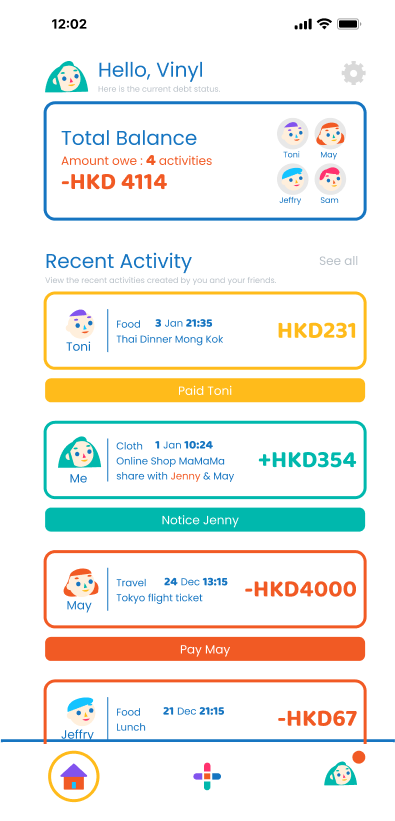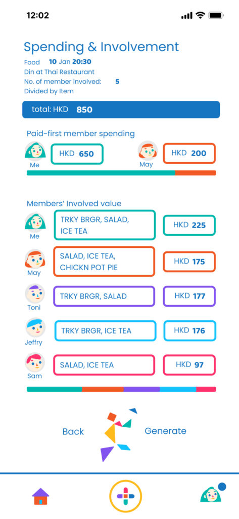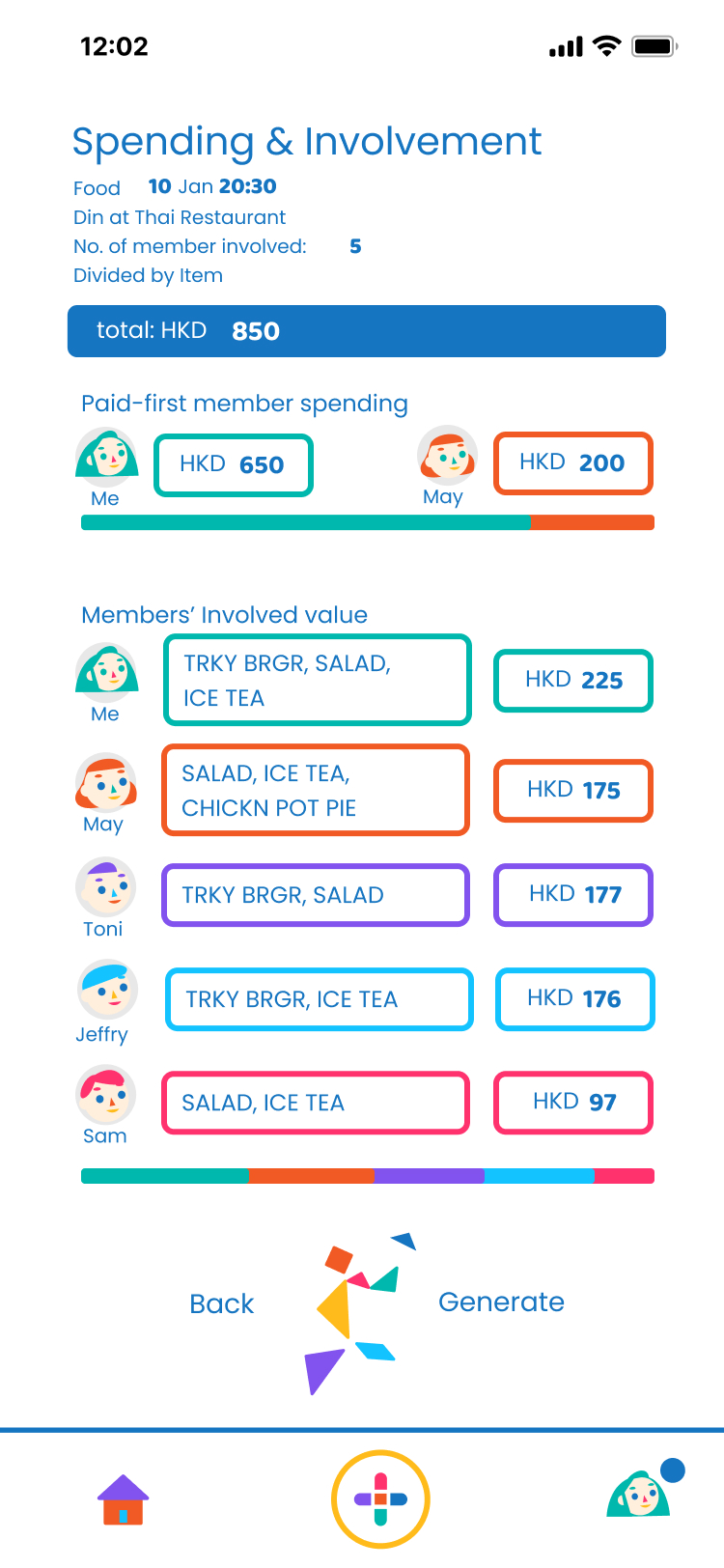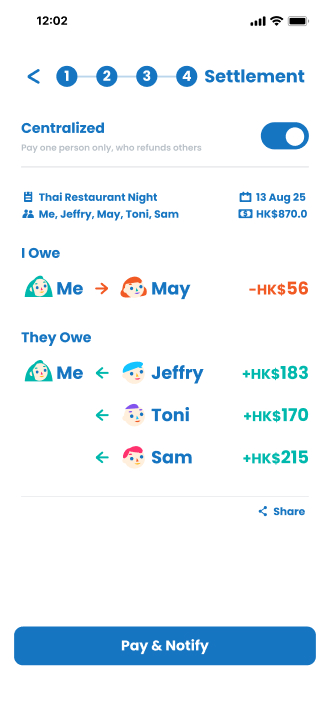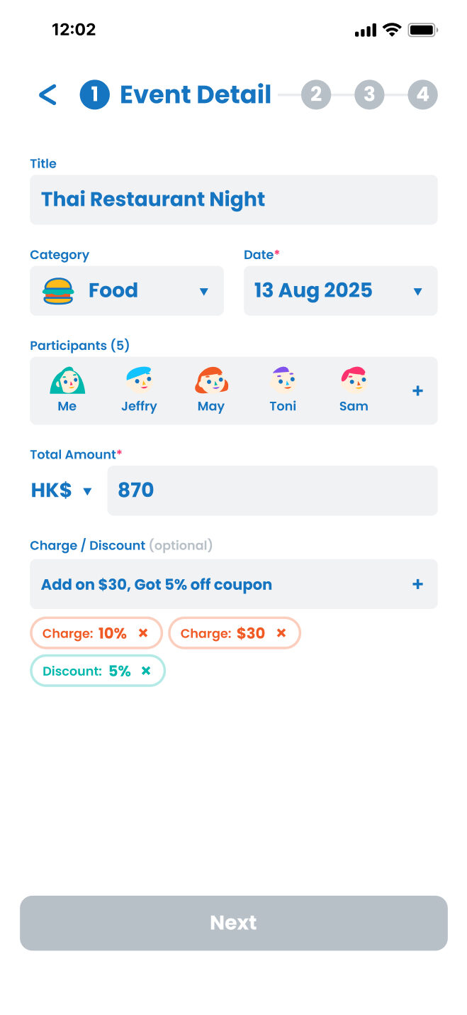 They create events via photo scanning or manual entry, then add the payment made and assign items by involvement.